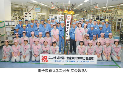 達成を記念して、生産拠点である千里丘事業所「ECOCUBE」製造ラインにて、多山社長をはじめ取締役青木計測システム事業部長や製造スタッフ参加のもと、お祝いのくす玉割り、記念撮影を行いました。平成21年5月から生産を開始、約6年5ヶ月での達成となりました。 多山社長は挨拶で、「電力量計ユニットは電気の“見える化”を進めるなど、多様なサービスが生まれる可能性を秘めた製品である。日本でトップの電力量計ユニットの累計台数を生産する製造ラインで働いていることに誇りを持ち、「品質第一」を心掛け、責任を持って生産に取り組んでほしい」と述べました。 当事業部では、今後もさらなるコスト低減、品質向上に取り組み、お客さまに満足していただける製品の安定供給に努めてまいります。